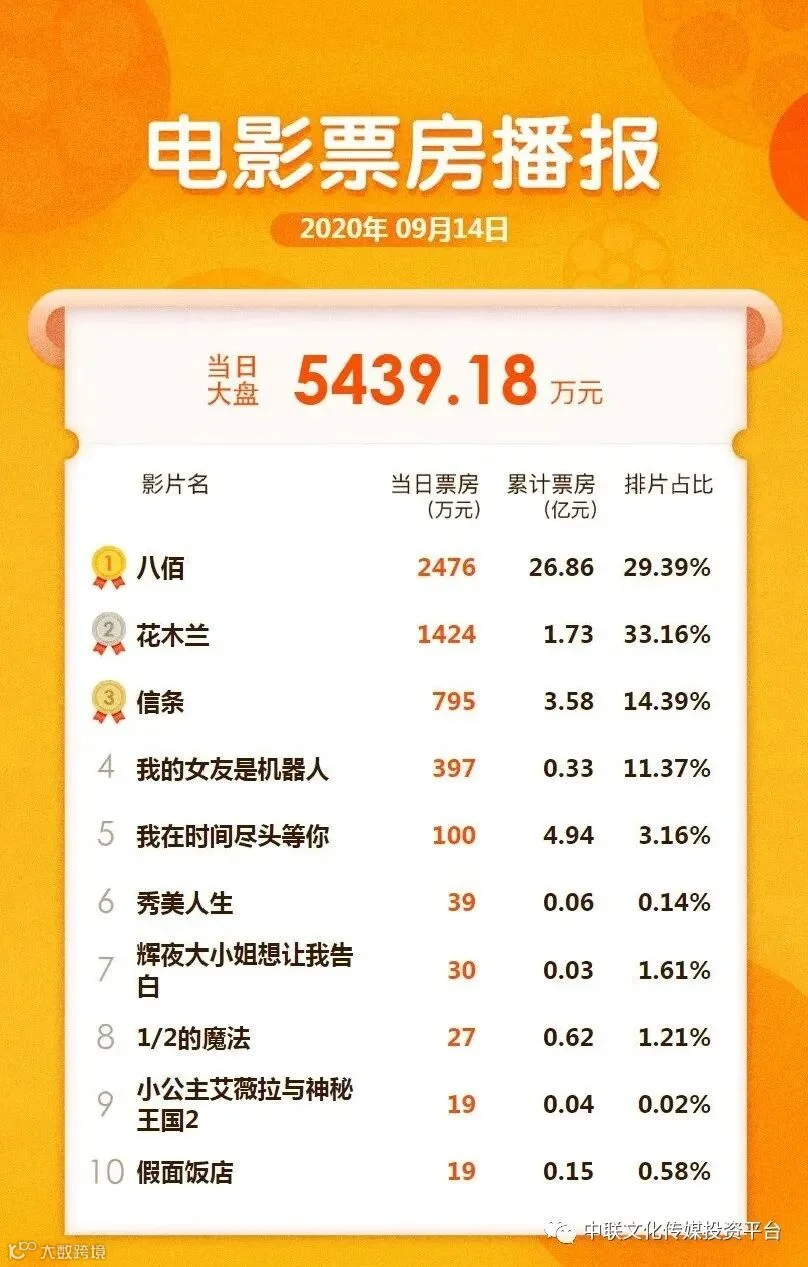 截止到2020年9月14日,全国电影市场复工57天累计票房52.28亿!《八佰》单日票房2476万蝉联冠军,累计票房26.86亿,暂列中国市场影史票房榜第十位。七夕档最大赢家《我在时间尽头等你》日票房100万,累计票房即将突破5亿。