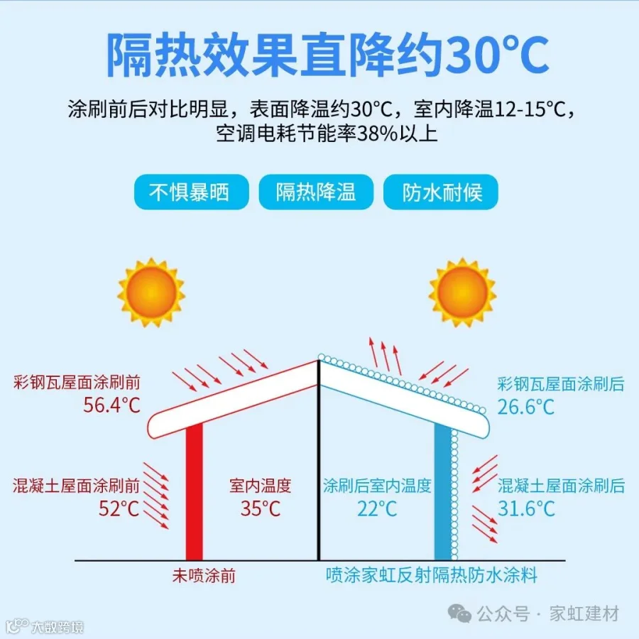 随着夏天的到来,许多地区天气逐渐高温,夏天最头疼的就是房间温度高,所以选隔热涂料,隔热效果是关键。在选择时,一定要注意选购具有较高隔热性能的涂料。可以看看产品说明,找到隔热性能指数高的产品,这样才能有效阻挡热量的传导和辐射,降低室内温度,在这推荐一款家虹牌的反射隔热涂料。