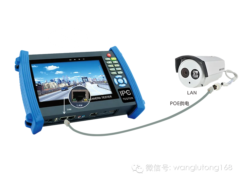 将网络摄像机的LAN接口通过网线连接工程宝底部LAN接口,工程宝给摄像机POE供电。如下图:(本例中的摄像机是POE摄像机,可以使用工程宝给摄像机POE供电,不支持POE供电的摄像机用12V 给摄像机供电)
