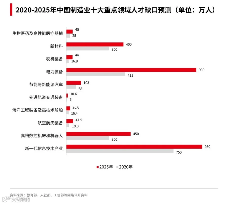 根据教育部、人社部、工信部联合印发的《制造业人才发展规划指南》统计,全国制造业重点领域人才缺口在2025年将接近3000万人,缺口率高达48%。