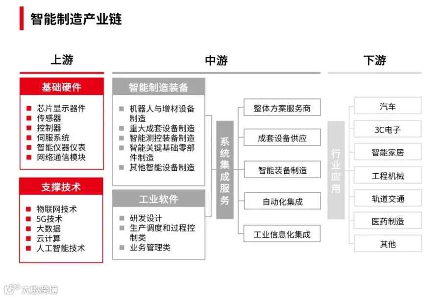 智能制造产业链的上游,主要包括基础硬件与关键技术支撑两个部分。基础硬件是智能制造系统的基本组成单元,负责数据的采集、传输和控制,主要包括芯片、传感器、控制器、伺服系统、智能仪器仪表、通信设备等。支撑技术能够为智能制造提供强大的计算和数据处理能力,以及智能化的决策支持,主要包括5G、云计算、大数据、物联网、人工智能等。