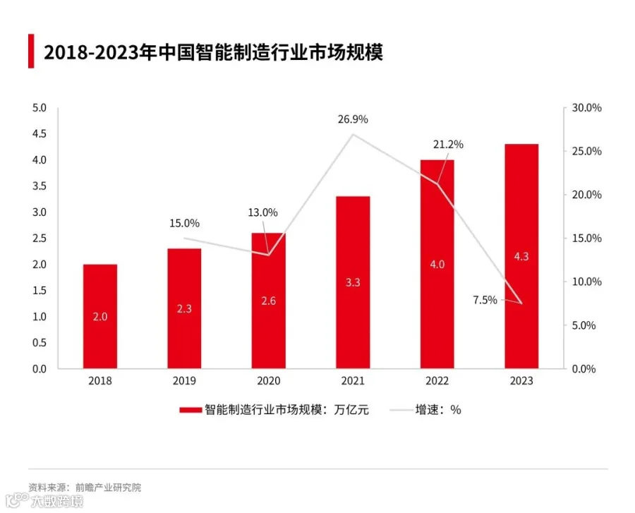 近年来,受到国家政策支持以及数字化的不断推行,中国智能制造行业市场规模整体保持增长趋势。数据统计,2023年中国智能制造行业市场规模同比增长7.5%至4.3万亿元。