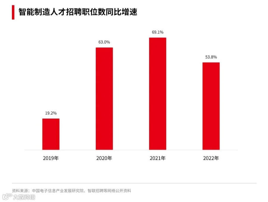 近年来,全国各地加快推进制造业转型升级,智能制造成为引领经济高质量发展的重点领域,产业规模迅速扩张,用人需求持续增长。相关数据显示,2022年智能制造领域招聘职位数同比增长53.8%,2020-2022年招聘职位数同比增幅均在50%以上。