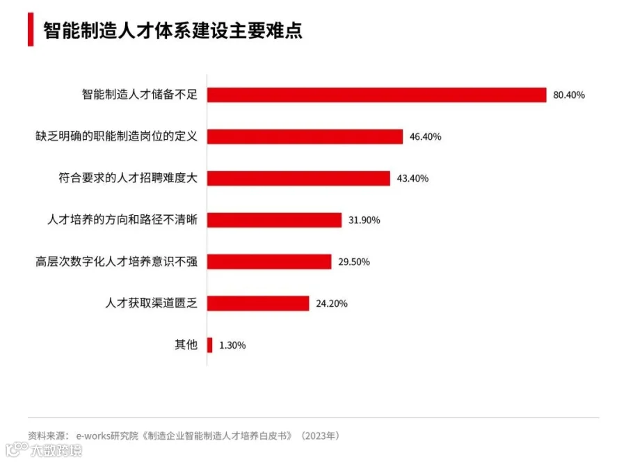 智能制造需要各类工程师和技术人才通过长期的训练、实践和学习,同时涵盖机器学习、深度学习、数据挖掘等多种数字技术,从而形成对自身行业的多层次理解和认知,但是职业教育水平相对较低也阻碍了培养优秀人才的步伐,中国智能制造尤其缺乏拥有具备海外背景、跨文化沟通能力较强的国际人才。