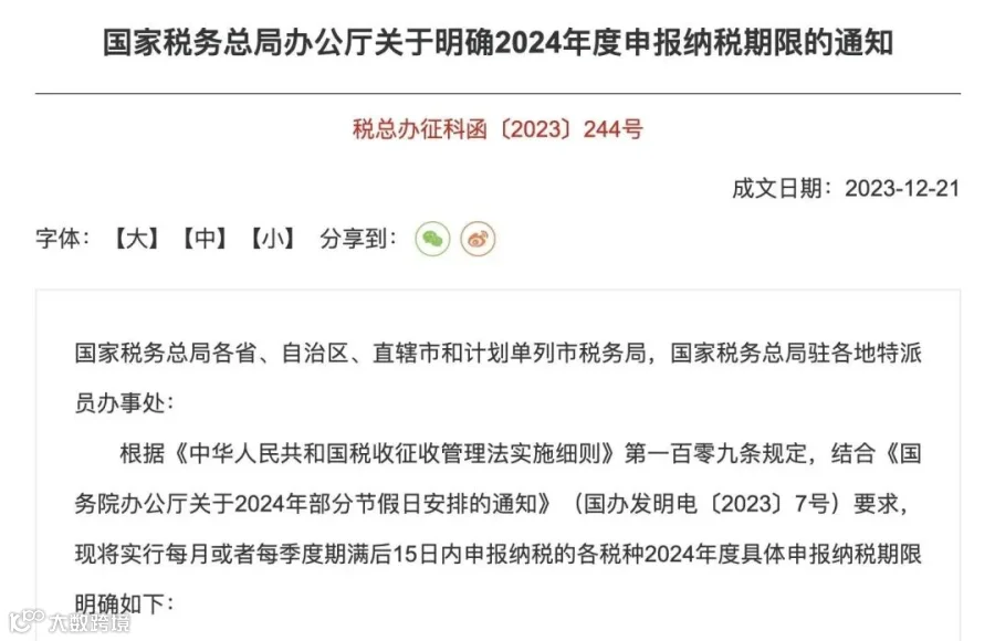 近日,国家税务总局办公厅发布通知,明确了2024年度具体申报纳税期限。