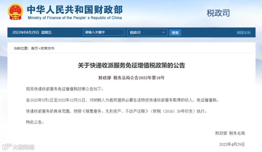 4月27日,国务院常务会议上,要求从5月1日起到年底,将对符合条件的快递收派收入免征增值税。