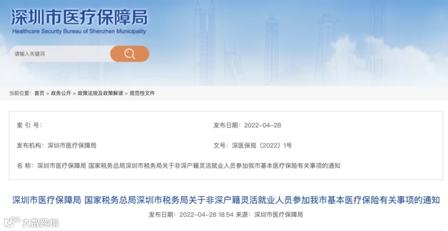 深圳市医疗保障局联合国家税务总局深圳市税务局印发《关于非深户籍灵活就业人员参加全市基本医疗保险有关事项的通知》,于2022年5月10日起正式实施,非深户籍灵活就业人员可按规定申请参加全市基本医疗保险。
