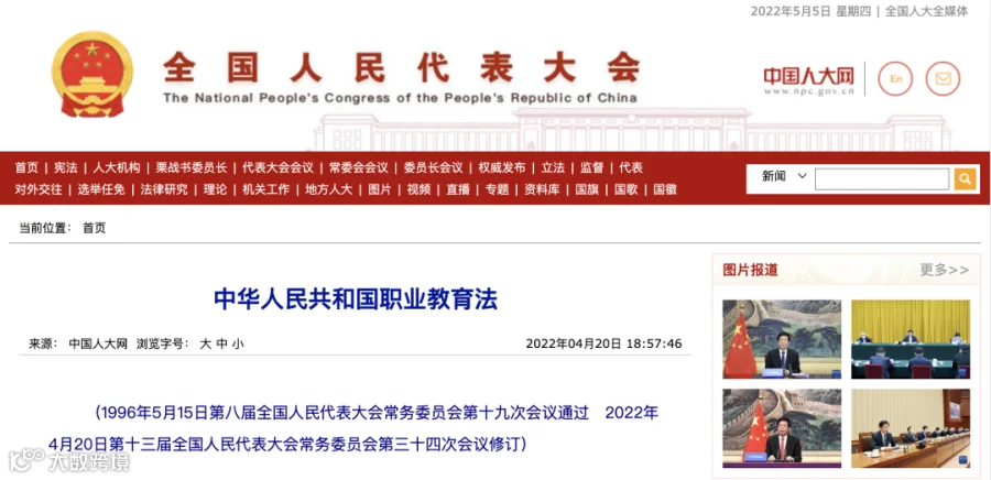 新修订的《中华人民共和国职业教育法》5月1日起施行。明确职业教育是与普通教育具有同等重要地位的教育类型。