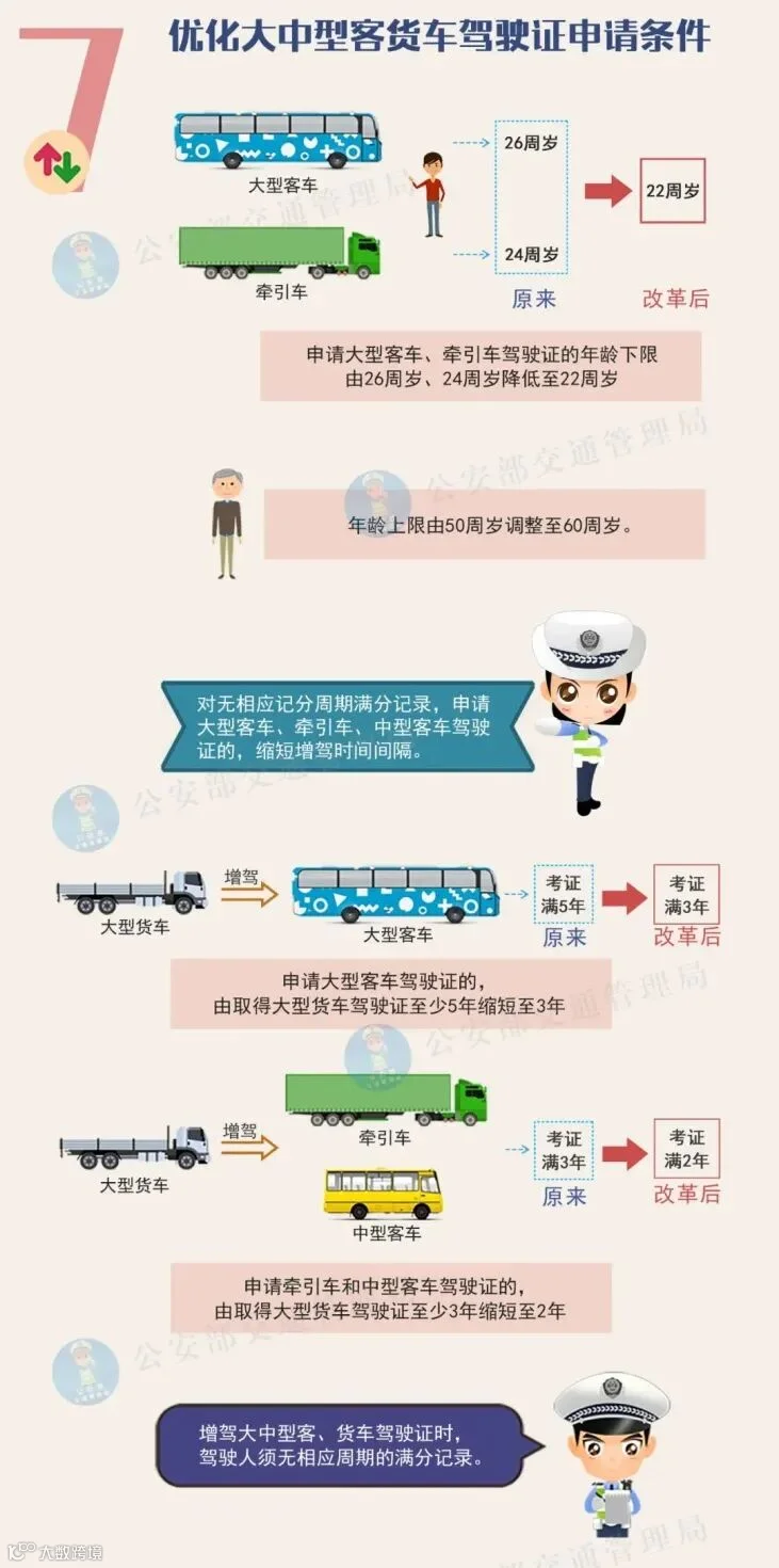 1、申请大型客车、牵引车驾驶证的年龄下限由26周岁、24周岁降低至22周岁,申请大中型客货车驾驶证年龄上限由50周岁调整至60周岁。