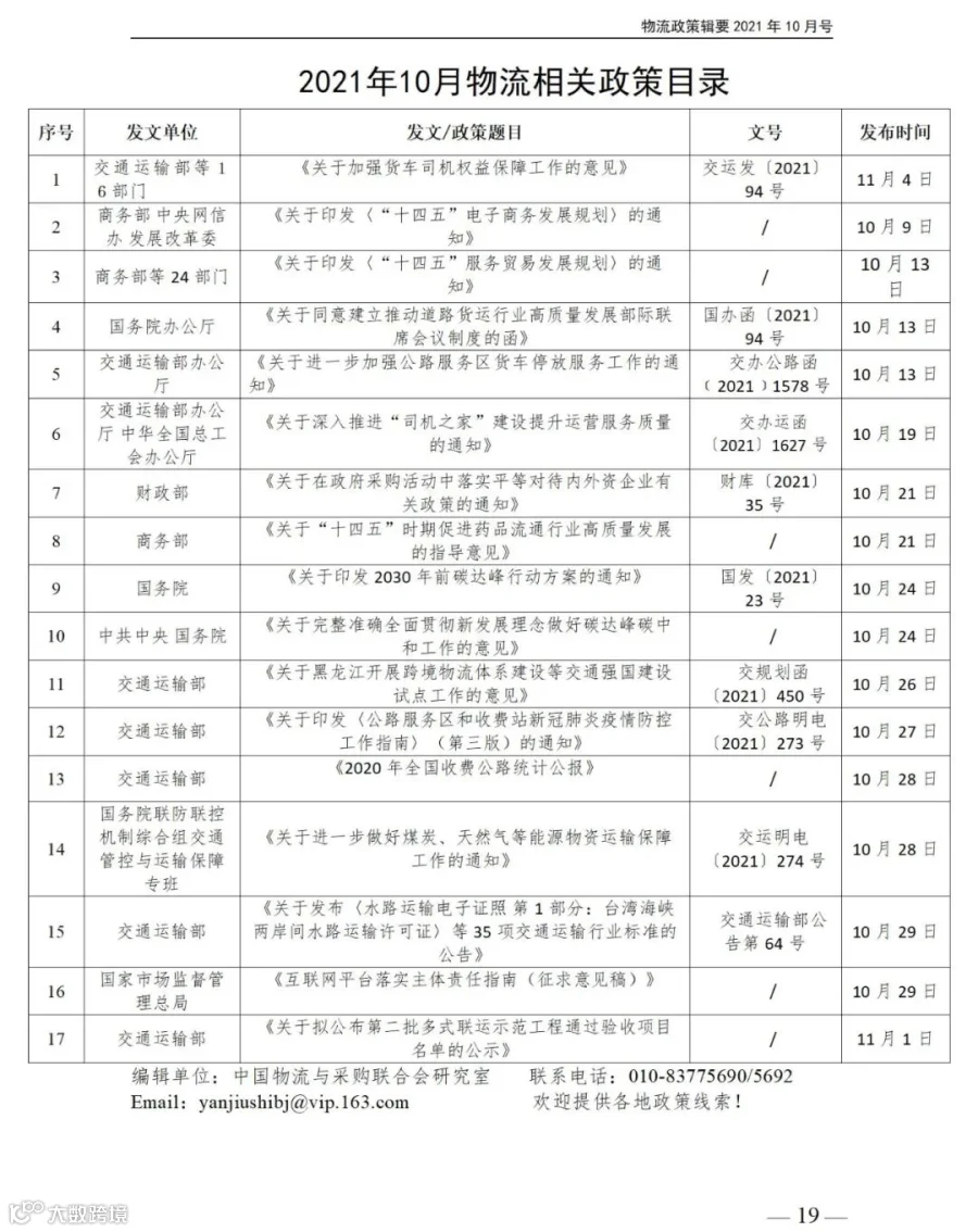 2021年10月物流相关政策目录