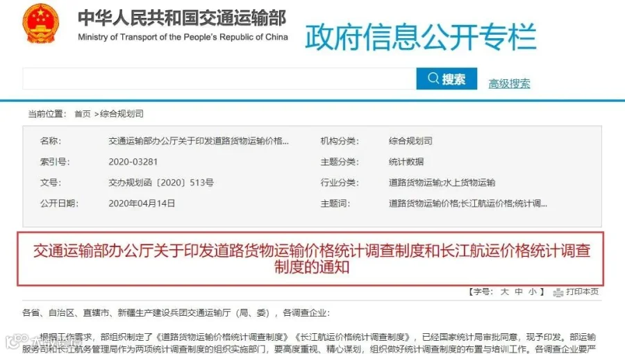 4月14日,交通运输部官网发布《关于印发道路货物运输价格统计调查制度和长江航运价格统计调查制度的通知》。