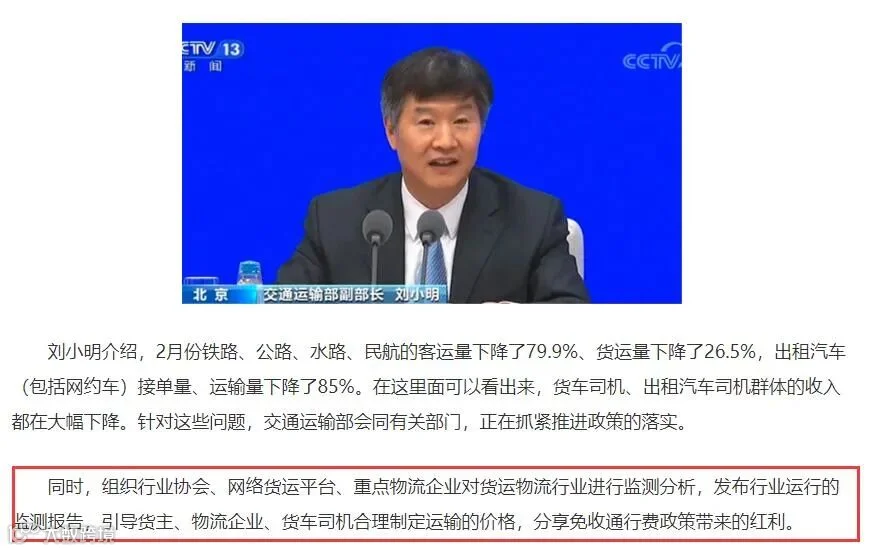 他强调“交通运输部将会同有关部门,正在抓紧推进政策的落实。组织行业协会、网络货运平台、重点物流企业对货运物流行业进行监测分析,发布行业运行的监测报告,引导货主、物流企业、货车司机合理制定运输的价格,分享免收通行费政策带来的红利。“