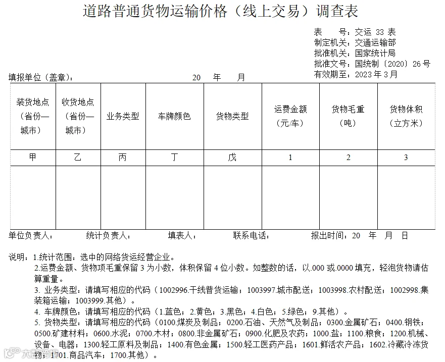 道路普通货物整车运输价格(线下交易)调查表