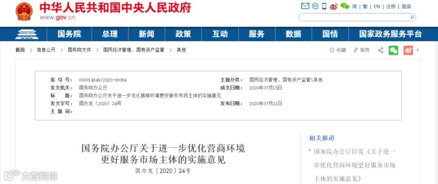 7月21日,国务院印发了《国务院办公厅关于进一步优化营商环境,更好