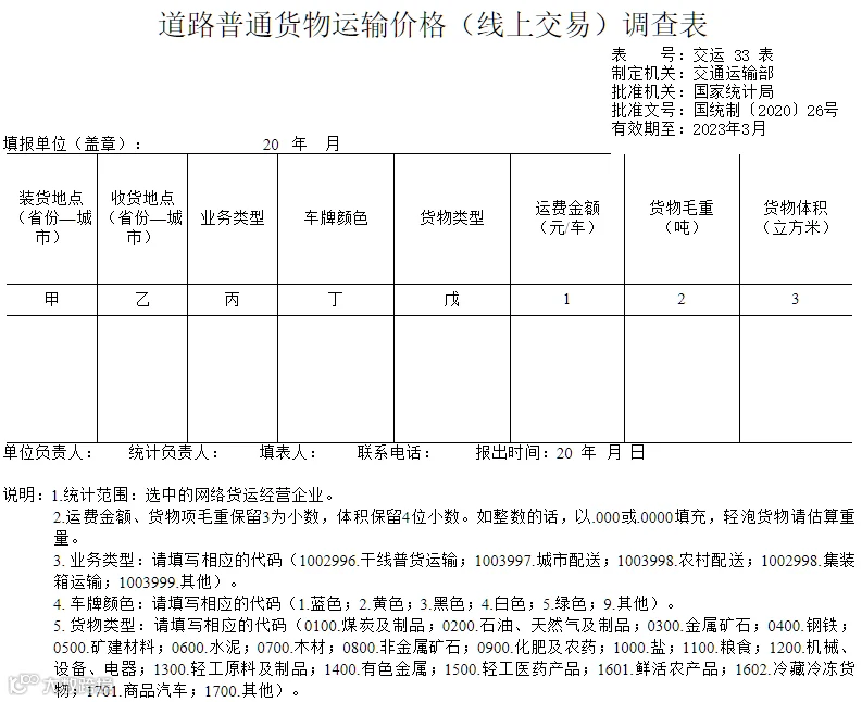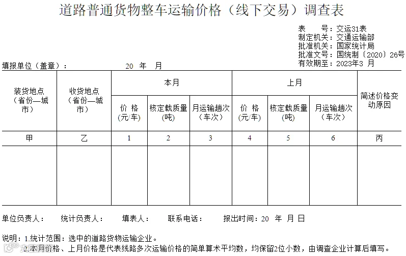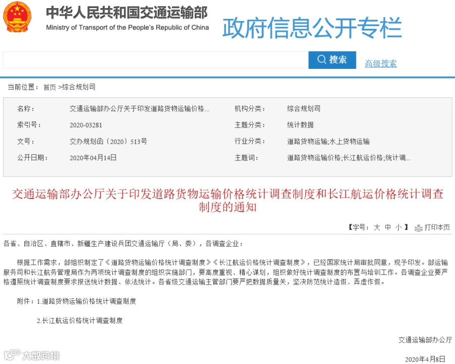 4月14日,交通运输部官网发布文件《交通运输部办公厅关于印发道路货物运输价格统计调查制度和长江航运价格统计调查制度的通知》,旨在在科学、准确地反映道路货物运输价格总水平、变动幅度及其变动趋势,为国家及有关部门进行宏观调控及道路运输市场动态监测提供依据。