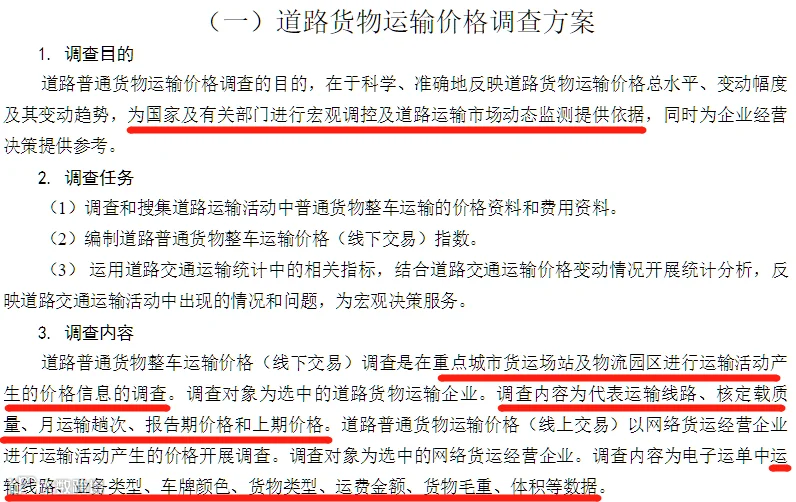 此次,交通部开展的货物运输价格调查行动,不论从规模还是调查内容都十分到位。其中提到调查目的时明确表示:为国家及有关部门进行宏观调控及道路运输市场动态监测提供依据。
