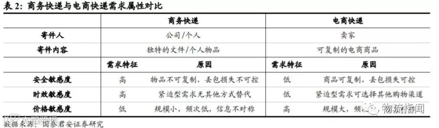 从需求端视角,商务快递拥有“两高一低”的需求属性,而电商快递拥有“两低一高”的需求属性。