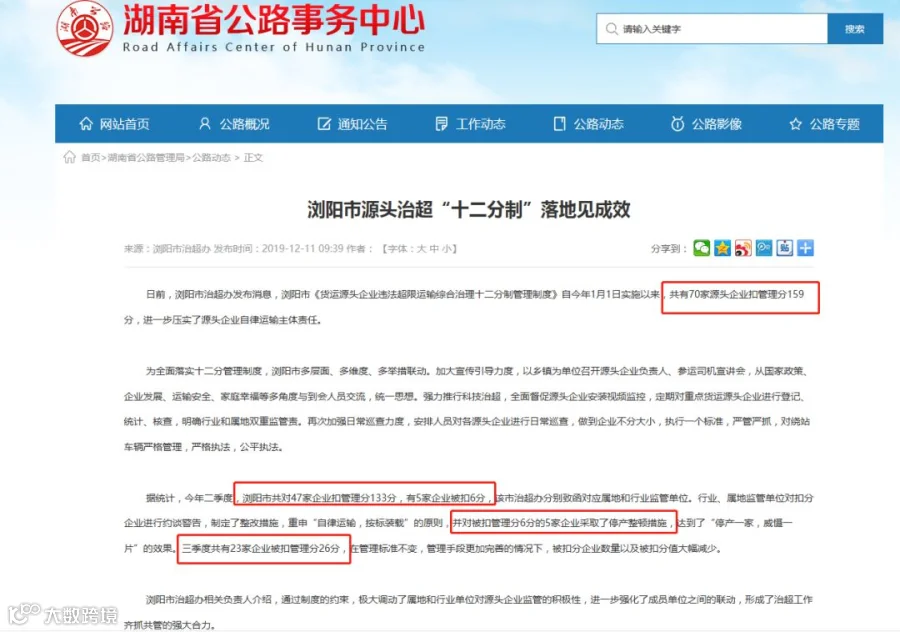 除上述地区外,浏阳市为进一步规范货运源头企业合法装载,遏制超限运输违法行为,浏阳市在长沙首推货运源头企业“十二分”管理制度,一个年度内扣满12分的源头企业,将被依法进行行政处罚、退出整合、关停等。