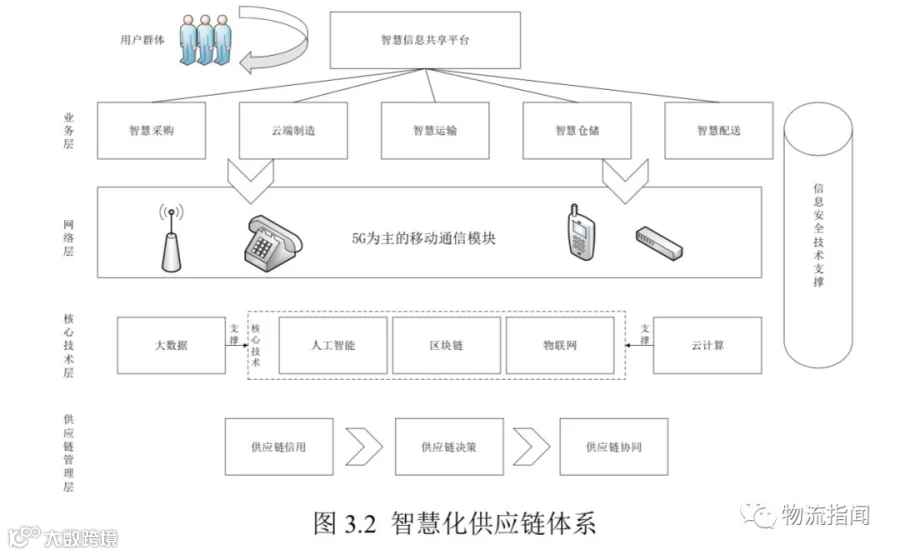 区块链是一种安全的分布式货币技术,可以实现多方安全共享数据,具有去中心化、不可篡改、全网入账等优势,将会重构社会信用体系。区块链技术可以成为智慧供应链的一种信用机制,构建智慧供应链信息共享生态圈。人工智能技术主要负责智能决策,使智慧供应链的各环节可以变成动态可控的管理层次。物联网技术主要增加智慧供应链组件之间的协同性,有助于物流向整体化、智慧化发展。无论区块链、物联网还是人工智能,都需要大量的边缘计算节点,5G作为一个海量接入和按需组网的移动通信技术,能够提供稳定的数据交互平台,同时能够促进计算效率。因此,5G是智慧化供应链体系发展环节中必不可少的模块。