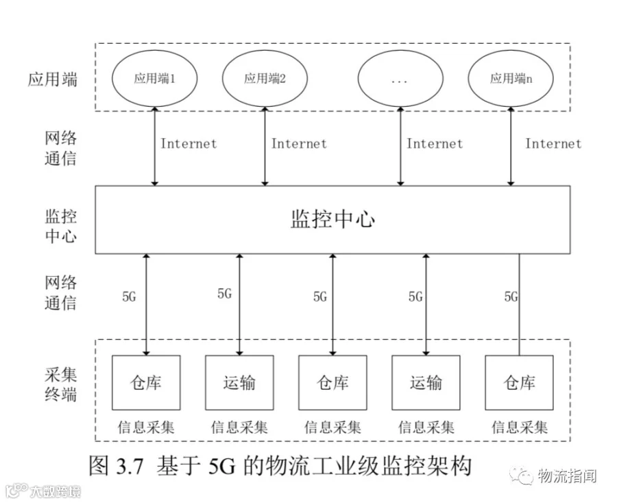 基于5G的新一代物流工业级监控架构如图3.7所示。5G作为稳定的高带宽通信技术,在工业级的智能监控中可以以稳定带宽将运输和仓储过程中出现的问题以视频或者图像等数据形式及时反馈到数据中心,因此相比传统的通信技术,5G将会使得物流监控这一核心的环节变得更加高效智能。