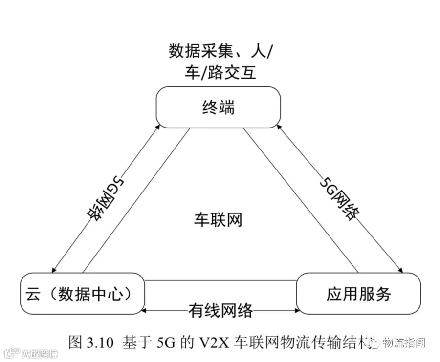 5G将在4G的LTE技术上优化推行,因此5G更能推进这种车联网模式以及无人驾驶技术在新一代物流中使用,主要解决物流运输中车辆之间的“共享传感”问题,可以有效地将自动化驾驶物流车辆的雷达等探测设备从数十米的视距扩展到上百米,同时低时延、高带宽的5G能够提升物流车辆载入AI系统的效能,能够在复杂的运输环境下实现自动化物流运输。基于5G网络下的V2X车联网物流传输场景具体结构如图3.10所示。