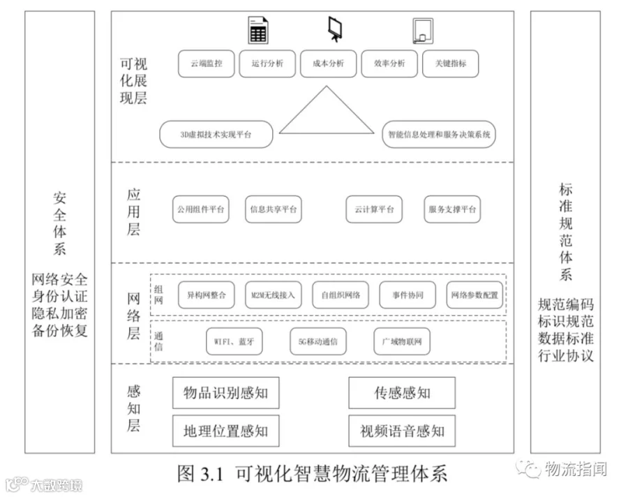 图中显示,该体系架构具有四个层面,包括感知层、传输层、应用层以及可视化展现层,每层都需要具有一定的安全体系和标准规范。其中感知层负责部署底层数据采集设备,例如仓储过程中的PDA采集器、QR码的扫码枪、传感器、视频摄像头以及语音感知设备等等,这一层主要负责数据的收集和整合。