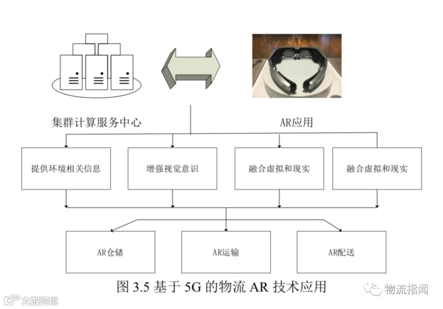目前,AR技术并没有被大量地在企业级中推广,主要原因是现有通信技术的带宽无法支撑AR应用的商业应用。新一代移动通信技术5G具有很高的带宽,并且大规模MIMO技术使得其通信稳定,同时5G对移动边缘计算的支撑,可以作为AR这种高效能视觉应用的数据通信技术。因此,下一代物流的AR技术将会依赖5G作为其数据通信的支撑,具体的应用场景如图3.5所示。