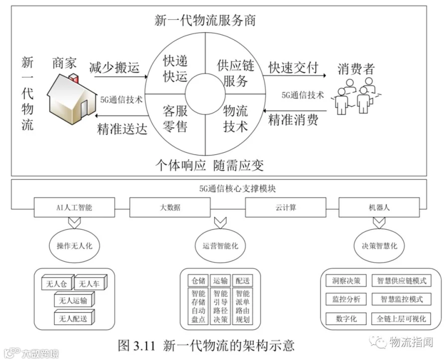 5G能够被广泛应用于物流中,主要是因为物流与物联网的紧密关系,5G海量接入的特性促进物联网在物流行业的应用,促进物流的智慧化发展。新一代物流具有复杂的架构体系,面向智慧化发展,同时具有短链和共生的特征,灵活兼容性强,因此5G使得新一代物流具有良好的接入特性和智慧特性。新一代物流中,智慧化海量接入的物流体系主要有可视化智慧物流管理体系、智慧化供应链体系、智慧化物流追溯体系。