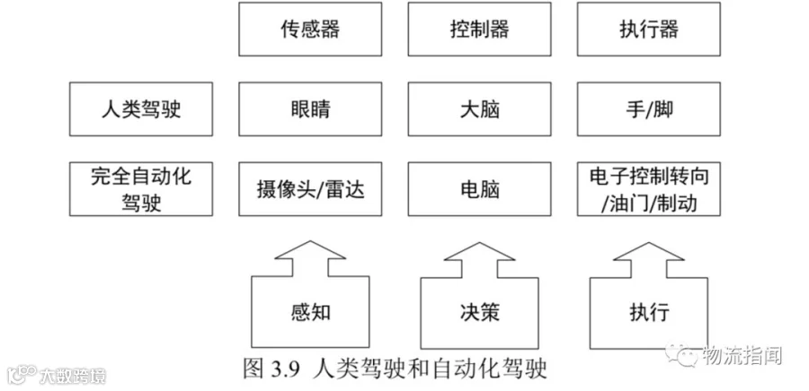 全自动化控制的物流运输相比传统运输行业,主要目的是解放物流公司驾驶员、快递派送人员以及外卖派送人员的双手,利用计算机进行运输路径的规划和决策,利用智能计算完成对临时环境的分析,显得更加安全和高效。如图3.9所示,传统物流运输和全自动化控制的物流运输区别在于更智能、更高效的全自动化特征。