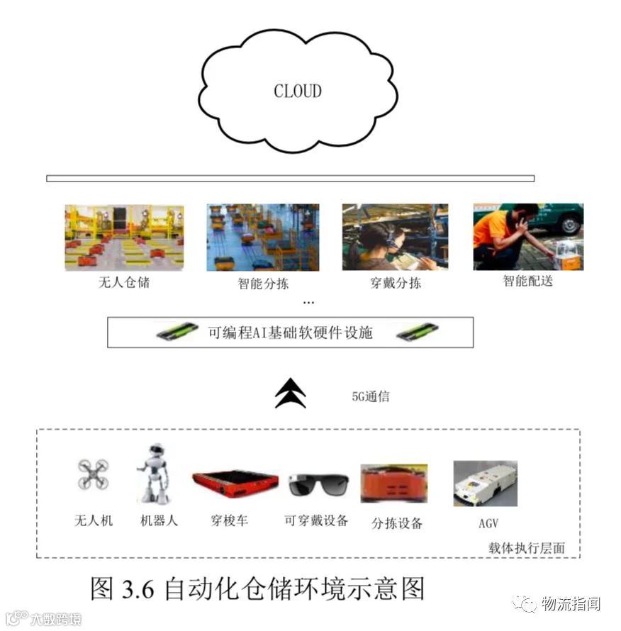 在新一代物流行业中,物流仓储环节需要全面自动化,这就需要人工智能技术的推进,目前已经有很多智能的机器人设备被用在仓储环节中实现自动化物流分拣、自动化物品传输以及自动化出入库等等。在新一代移动通信技术5G 的推动下,仓储环境的全面自动化变得更有希望。5G与人工智能技术的结合也是必然趋势,很多机器人设备嵌入的硬件芯片在已有通信技术支撑下由于时延、能耗等问题往往不能发挥更多作用,因此5G的可靠性传输性能够推动智能机器人的使用。目前,物流已经有很多地方开始使用人工智能技术,有很多机器人类似的硬件设备已经被用来为物流服务。