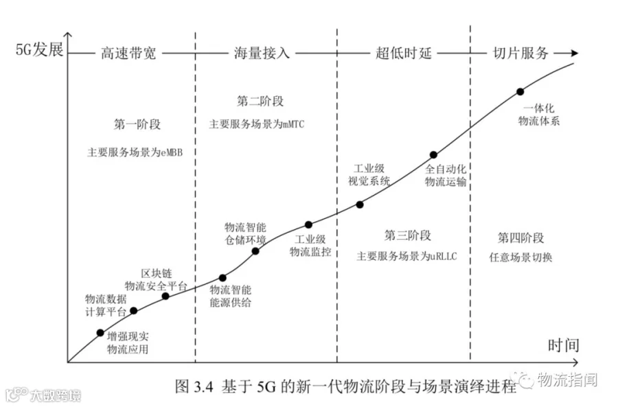 本节将具体介绍5G与新一代物流结合的场景,并分析5G对于这些场景形成的优势,这些场景有些将随着5G的商用会立即实现,有些可能需要在5G推广后期才能实现,因此基于5G的新一代物流发展也是循序渐进的,不是一蹴而就的,具体演绎的过程如下图3.4。