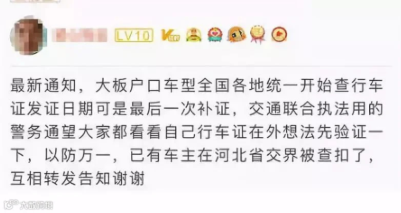 最近有卡友反映,全国各地开始统一查大板车的行车证发证日期可是最后一次补证,已有车主在河北省交界被查扣。