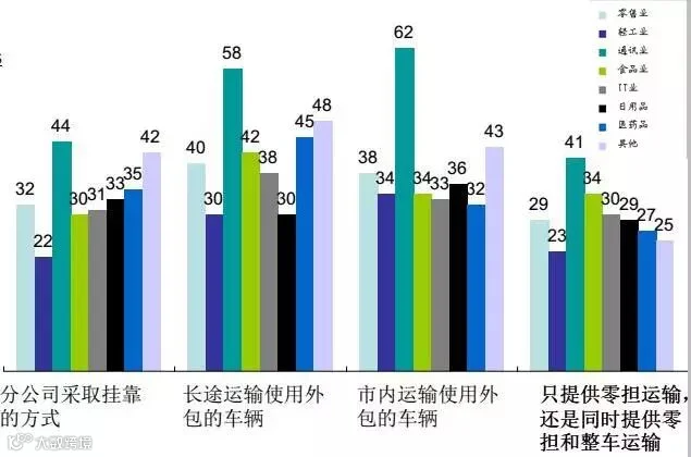 货主考虑承运商自由的运输能力与外包能力的考虑,在不同行业来看,通讯行业对于这些因素表示较高关注,而轻工业产品而认为影响小;(其主要表现在掌控能力和赔付能力上)