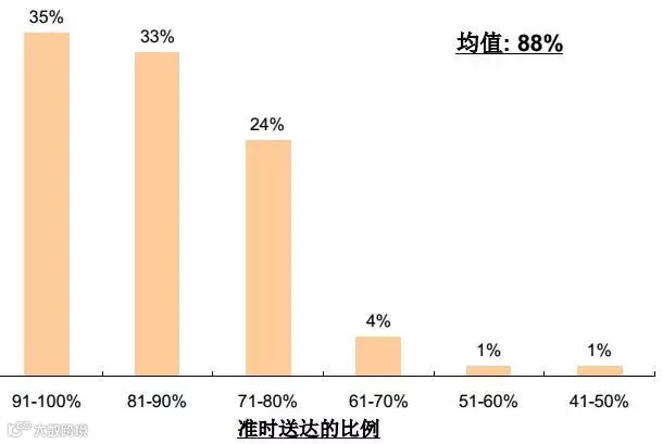 大多数认为目前运输上的准点率超过70%,准时送货和准时上门目前是用户关心的重要问题,市内送货的准时率希望在小时之内