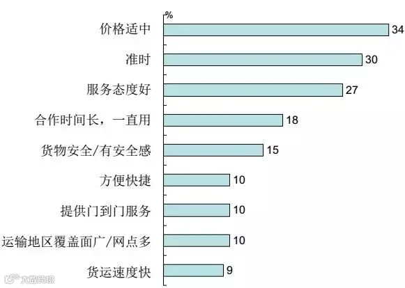 价格、准时和服务态度是使用当前零担运输商的主要原因,可以看出,价格在零担承运商中是主要原因。
