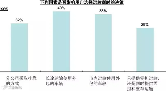 约1/3的用户认为这些因素将影响他们选择零担运输商时的决策,较为多的货主认为网店点覆盖和城市配送会对其决策产生影响;