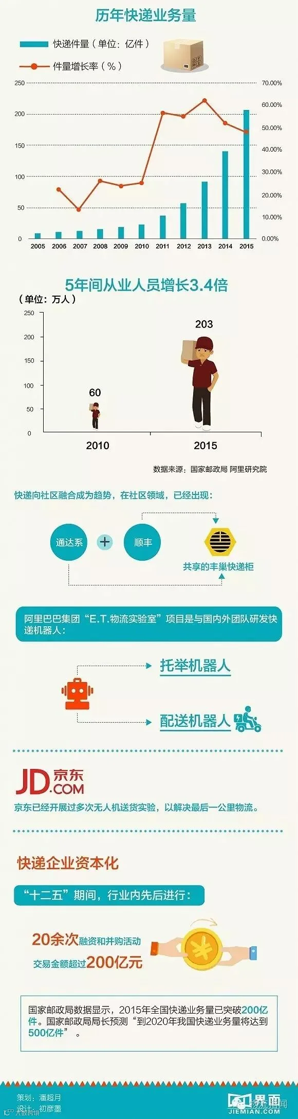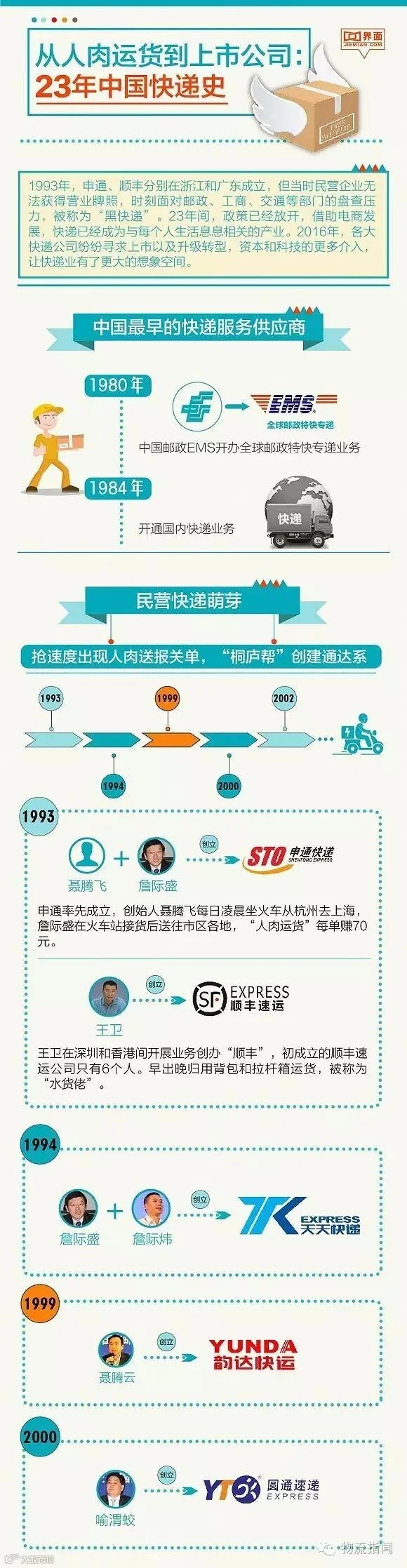 1993年,申通、顺丰分别在浙江和广东成立,但当时民营企业无法获得营业牌照,时刻面对邮政、工商、交通等部门的盘查压力,被称为“黑快递”。23年间,政策已经放开,借助电商发展,快递已经成为与每个人生活息息相关的产业。2016年,各大快递公司纷纷寻求上市以及升级转型,资本和科技的更多介入,让快递业有了更大的想象空间。