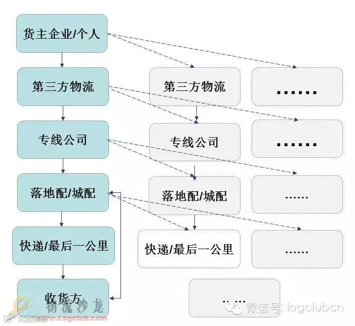 我国的物流有“散、小、乱、差”的特点。“散、小”是我们与国外物流的差别,并不能说这是缺点,改变“乱、差”是我们努力的方向。同时,虽然“散、小、乱、差”是当前的物流状况,但是并非无迹可循,在这样的状况后面,我们的物流如上图所示,也表现为一种层层分包和长链条的状况。由于层层分包,对货主企业/个人来讲,对干线运输缺乏管控,若有异常发生,运输将变成一件很痛苦的事情。从供应链管理角度来讲,信息的通畅对提高效率,优化供应链也有积极意义。现在市场上也出现了许多侧重运输管理的平台,除了各种管车软件,还有对全运输链条进行管理的平台。