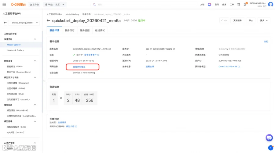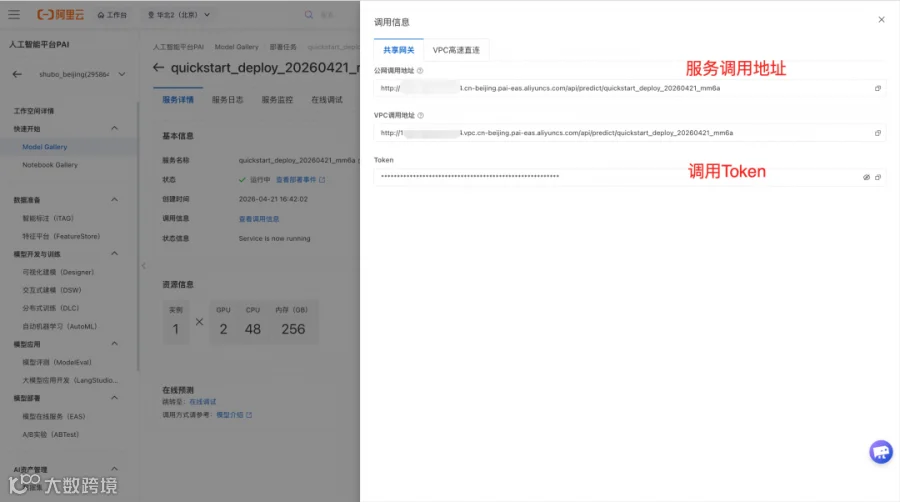 3. 部署成功后,在服务页面可以点击“查看调用信息”获取调用的调用地址和 Token,想了解服务调用方式可以在模型介绍页查看。