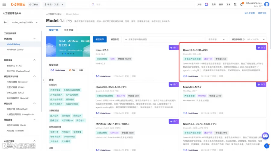 阿里云 PAI-Model Gallery 已同步接入 DeepSeek-V4、Kimi-K2.6、Minimax-M2.7、GLM-5.1 与 Qwen3.6-35B-A3B 等最新主流模型,提供企业级部署方案。