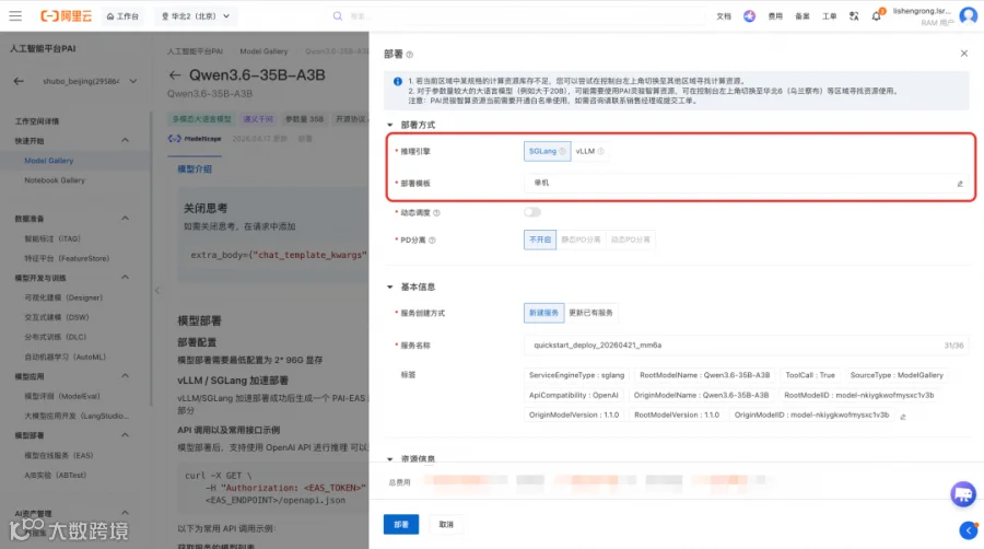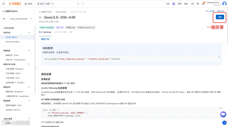 1. 在 PAI-Model Gallery 模型广场找到 Qwen3.6-35B-A3B 模型,或通过链接直达该模型:https://pai.console.aliyun.com/#/quick-start/models/Qwen3.6-35B-A3B/intro