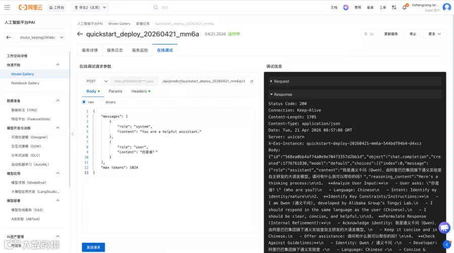 4. 使用推理服务:您可以在本地或使用各类客户端直接调用模型服务,也可以使用 PAI 平台提供的在线调试功能进行在线体验。详情可参考文档:https://help.aliyun.com/zh/pai/getting-started/model-gallery-quick-start#091a6b66e9v4x