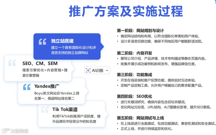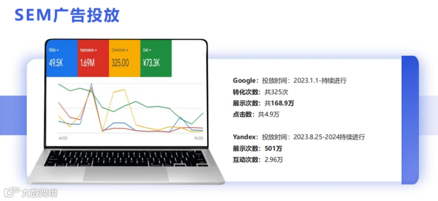 SEM(精准引流): 针对高意向询盘,我们在Google和Yandex平台上搭建了精细化的推广账户 。值得一提的是,博宇的英文网站在Yandex上排名第一,俄语网站排名第二,精准覆盖了东欧等核心市场 。