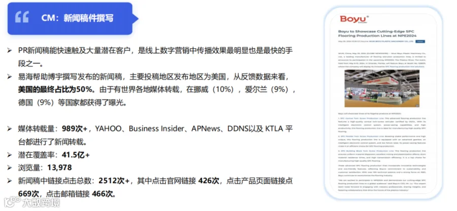 - 新闻传播: PR新闻稿的潜在覆盖率高达41.5亿+,点击官网的流量显著增加 。