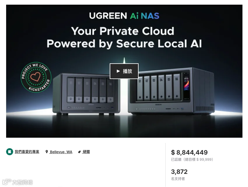 绿联UGREEN成功募集884.4万美元,获3,872名支持者,将NAS从"存储工具"升级为"本地AI大脑"。该设备不仅提供私有云存储,还能在本地完成AI搜索、文件整理及内容总结,构建面向个人和团队的本地AI数据中心。(内容分析基于公开数据)