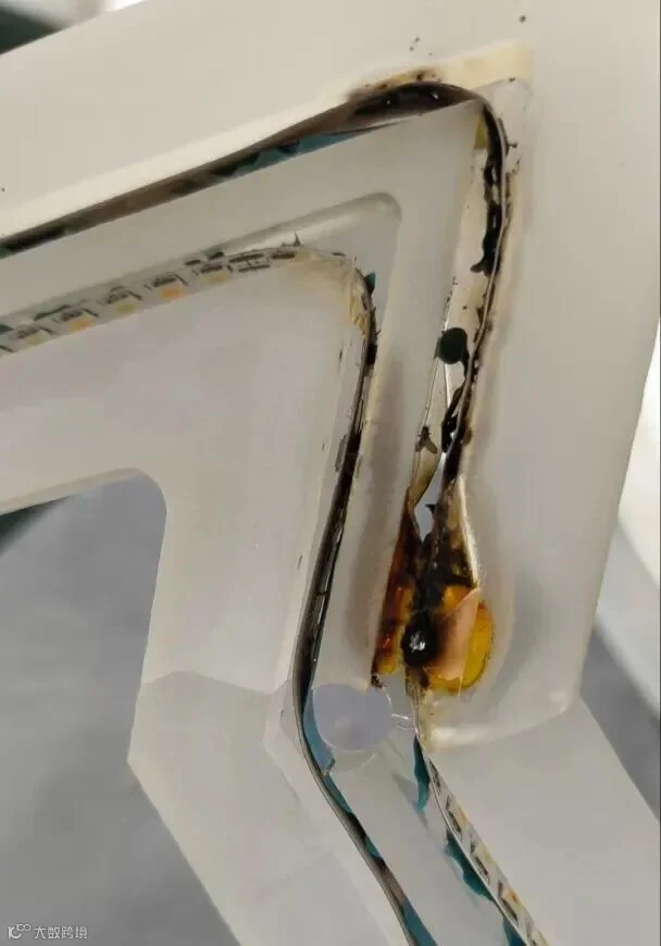 业内人士分析,该款侧发光设计灯具因软灯条重叠区域导致热量积聚,叠加未配置有效散热结构,最终因过热引发短路起火。