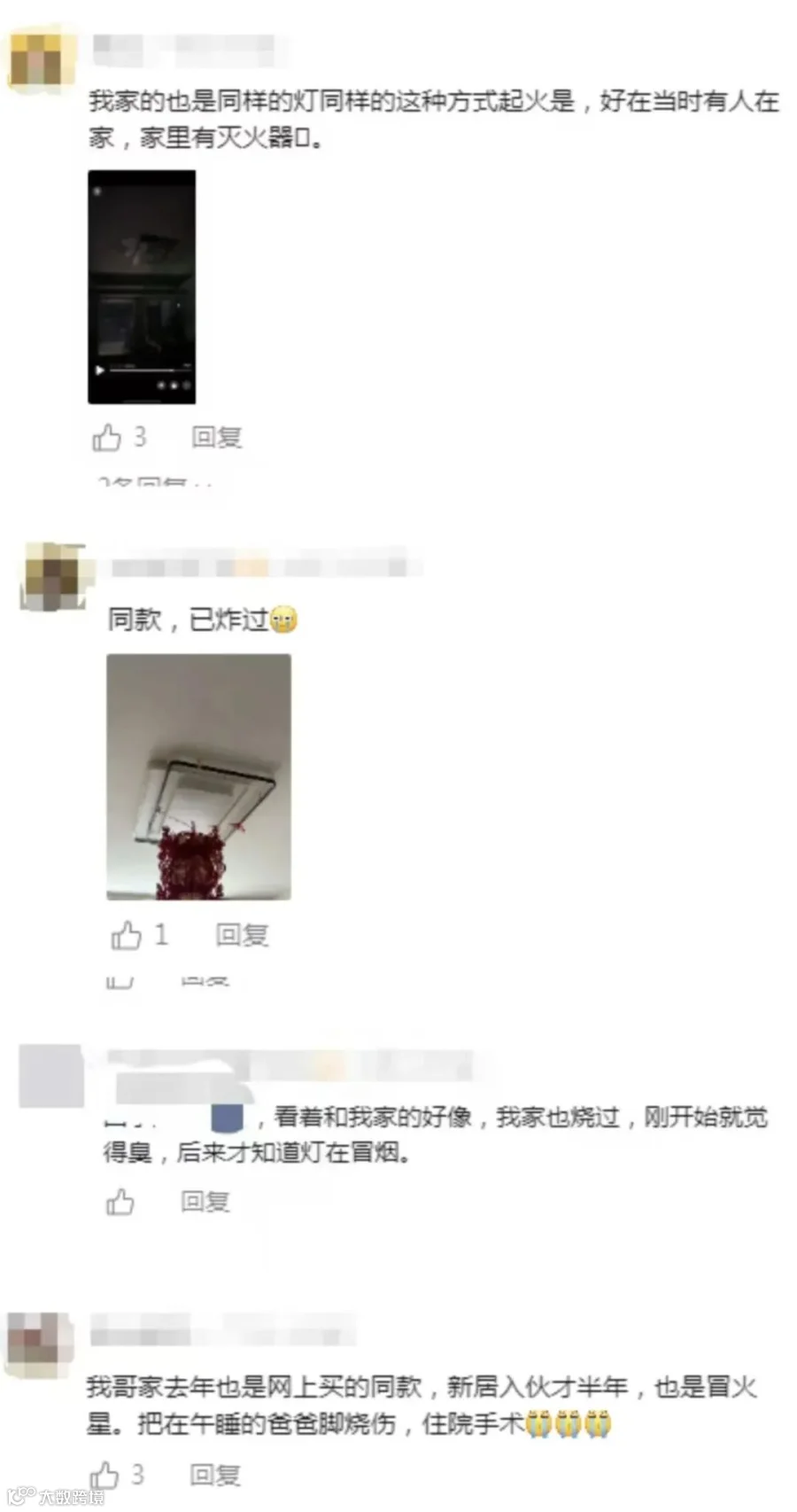 多地出现类似事故:广东用户反映"使用半年自燃致家人受伤";广西网友称"靠灭火器及时扑灭";青海用户则发现"焦味时灯具已冒烟"。