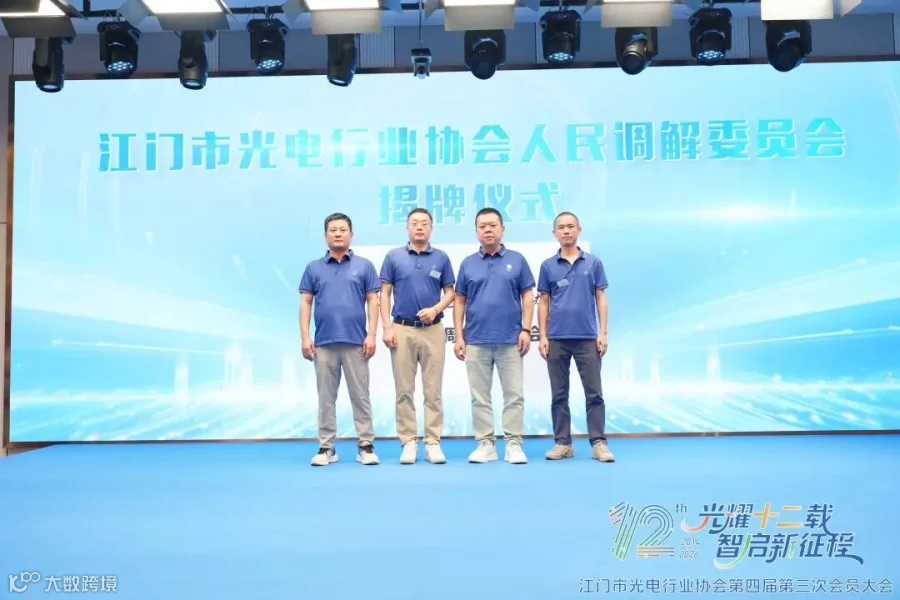 会议审议通过新会员名单及2025年度优秀会员评选结果,并举行新增理事会成员授牌仪式。同时,"江门市光电行业协会人民调解委员会"正式揭牌成立,标志行业在构建多元纠纷化解机制、深化治理创新方面取得实质进展。