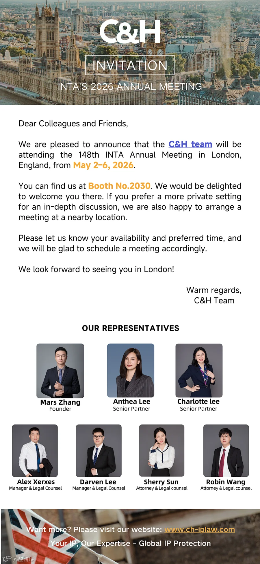 2026年5月2日-6日,第148届国际商标协会(INTA)年会将于英国伦敦ExCeL London国际会展中心举行,汇诚伙伴(C&H)将于NO.2030展位设展。