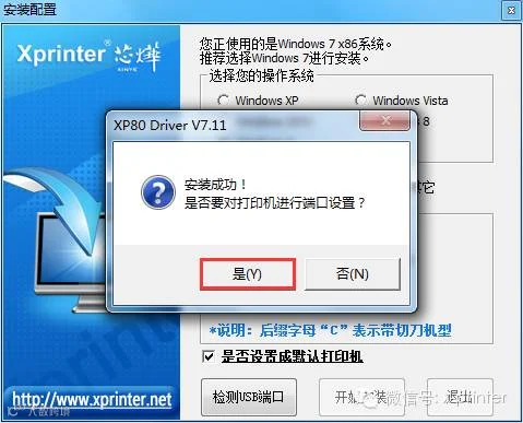 9、提示安装成功,请选择“是”进行打印机端口配置。如图: